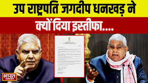 उपराष्ट्रपति जगदीप धनखड़ ने सोमवार को स्वास्थ्य कारणों का हवाला देते हुए देश के दूसरे सबसे बड़े पद से तत्काल प्रभाव से इस्तीफा दे दिया। राज्यसभा के सभापति धनखड़ ने कहा कि वह “चिकित्सकीय सलाह का पालन” करना चाहते हैं और स्वास्थ्य को प्राथमिकता देते हुए उन्होंने अचानक इस्तीफा दे दिया। “स्वास्थ्य सेवा को प्राथमिकता देने और चिकित्सीय सलाह का पालन करने के लिए, मैं संविधान के अनुच्छेद 67(ए) के अनुसार तत्काल प्रभाव से भारत के उपराष्ट्रपति पद से इस्तीफा देता हूँ। मैं महामहिम – भारत की माननीय राष्ट्रपति महोदया के प्रति उनके अटूट समर्थन और मेरे कार्यकाल के दौरान हमारे बीच बने सुखद और अद्भुत कार्य संबंधों के लिए हार्दिक आभार व्यक्त करता हूँ,” धनखड़ ने भारत की राष्ट्रपति द्रौपदी मुर्मू को लिखे एक पत्र में कहा। उन्होंने सहयोग के लिए प्रधानमंत्री नरेंद्र मोदी का भी आभार व्यक्त किया। धनखड़ ने सांसदों के साथ अपनी यादें ताज़ा कीं और कहा कि वह उन्हें संजोकर रखेंगे।
