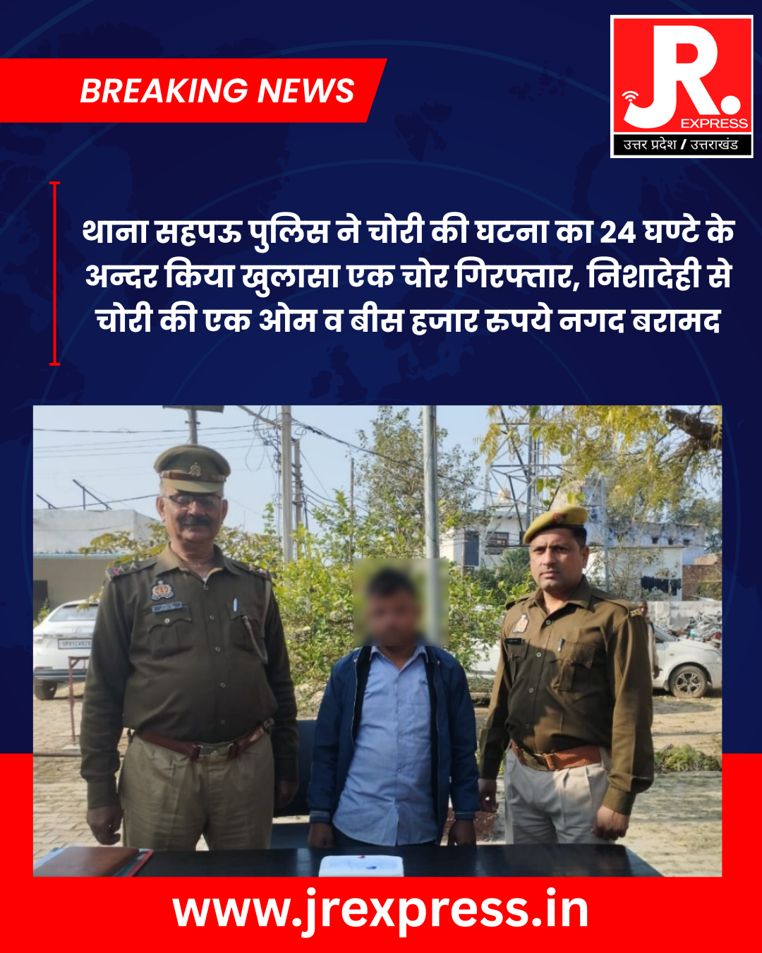 हाथरस। 02.12.2025 को वादिया द्वारा थाना सहपऊ पर सूचना दी कि 01.12..2025 को अज्ञात चोर द्वारा उसके बक्शे से आभूषण व नगदी चोरी कर ले गए है । वादिया की प्राप्त तहरीर के आधार पर थाना सहपऊ पर सुसंगत धाराओं में अभियोग पंजीकृत किया गया । उक्त घटना के सफल अनावरण हेतु पुलिस अधीक्षक चिरंजीव नाथ सिन्हा द्वारा अपर पुलिस रामानन्द कुशवाहा के निर्देशन में तथा क्षेत्राधिकारी सादाबाद के पर्यवेक्षण में थाना प्रभारी सहपऊ को घटना का सफल अनावरण कर अभियुक्तों की गिरफ्तारी व चोरी हुये माल की शतप्रतिशत बरामदगी के सम्बन्ध में निर्देशित किया गया था । जिसके क्रम मे गठित टीमों के कठिन परिश्रम व अथक प्रयासोपरान्त, ग्राउन्ड इंटेलीजेन्स, टेक्निकल साक्ष्य व प्राप्त अन्य लाभप्रद सूचनाओं के संकलन से मात्र 24 घण्टे के अन्दर दिनांक 03.12.2025 को थाना सहपऊ पुलिस द्वारा सराहनीय कार्य करते हुये थाना सहपऊ क्षेत्रान्तर्गत नगला बघेल मे हुई चोरी की घटना कारित करने वाले एक चोर को गिरफ्तार करने में महत्वपूर्ण सफलता प्राप्त हुई है।जिसका नाम लक्ष्मण उर्फ बाटी पुत्र पप्पू निवासी नंगला बघेल पिहुरा थाना सहपऊ जनपद हाथरस हैं।जिसके कब्जे/निशादेही से चोरी किये हुए एक ओम (पीली धातु), बीस हजार रुपये नगद बरामद हुए है । अभियुक्त की गिरफ्तारी एवं बरामदगी के सम्बन्ध में थाना सहपऊ पर आवश्यक विधिक कार्यवाही की जा रही है। गिरफ्तार करने वाली पुलिस टीम के नाम थानाध्यक्ष मयंक चौधरी मय टीम थाना सहपऊ जनपद हाथरस हैं।