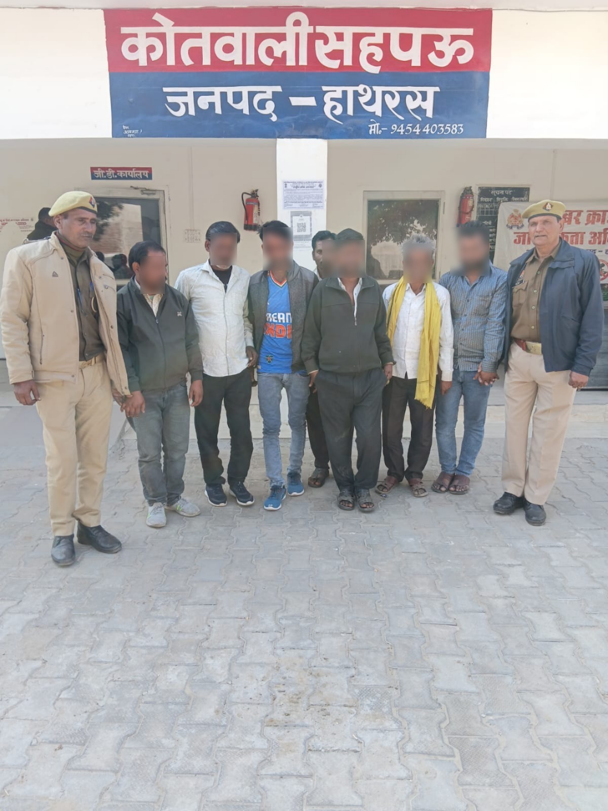 हाथरस। पुलिस अधीक्षक चिरंजीव नाथ सिन्हा के आदेशानुसार जुआ/सट्टे की रोकथाम हेतु चलाए जा रहे अभियान के क्रम में अपर पुलिस अधीक्षक के निर्देशन एवं क्षेत्राधिकारी सादाबाद के निकट पर्यवेक्षण में थाना सहपऊ पुलिस द्वारा मुखबिर की सूचना पर कार्यवाही करते हुए सात अभियुक्तों को हार जीत की बाजी लगाकर जुआ खेलते समय गिरफ्तार किया गया है । जिनके नाम दीपक पुत्र राजवीर निवासी मौहल्ला कोरियाना कस्वा व थाना सहपऊ, धर्मेन्द्र सिह पुत्र रेवतीराम निवासी कोरियाना कस्वा व थाना सहपऊ, नानिकचन्द्र पुत्र काली चरन निवासी मौहल्ला कोरियाना कस्वा व थाना सहपऊ, पप्पू पुत्र केदारी लाल निवासी मौहल्ला पुराना थाना कस्वा व थाना सहपऊ, मोहित पुत्र राम किशन निवासी मौहल्ला पुराना थाना कस्वा व थाना सहपऊ, शीलेन्द्र पुत्र मथुरा प्रसाद निवासी मौहल्ला पुराना थाना कस्वा व थाना सहपऊ, हरी शंकर पुत्र भगवान सिह निवासी मौहल्ला पुराना थाना कस्वा व थाना सहपऊ जनपद हाथरस है। जिनके कब्जे से 1325/- रूपये नगद, 52 पत्ता ताश बरामद हुए है। अभियुक्तगणों की गिरफ्तारी एवं बरामदगी के सम्बन्ध में थाना सहपऊ पर सुसंगत धाराओं में अभियोग पंजीकृत कर आवश्यक वैधानिक कार्यवाही की जा रही है । गिरफ्तारी करने वाली पुलिस टीम के नाम थाना प्रभारी मंयक चौधरी थाना सहपऊ मय टीम जनपद हाथरस हैं।