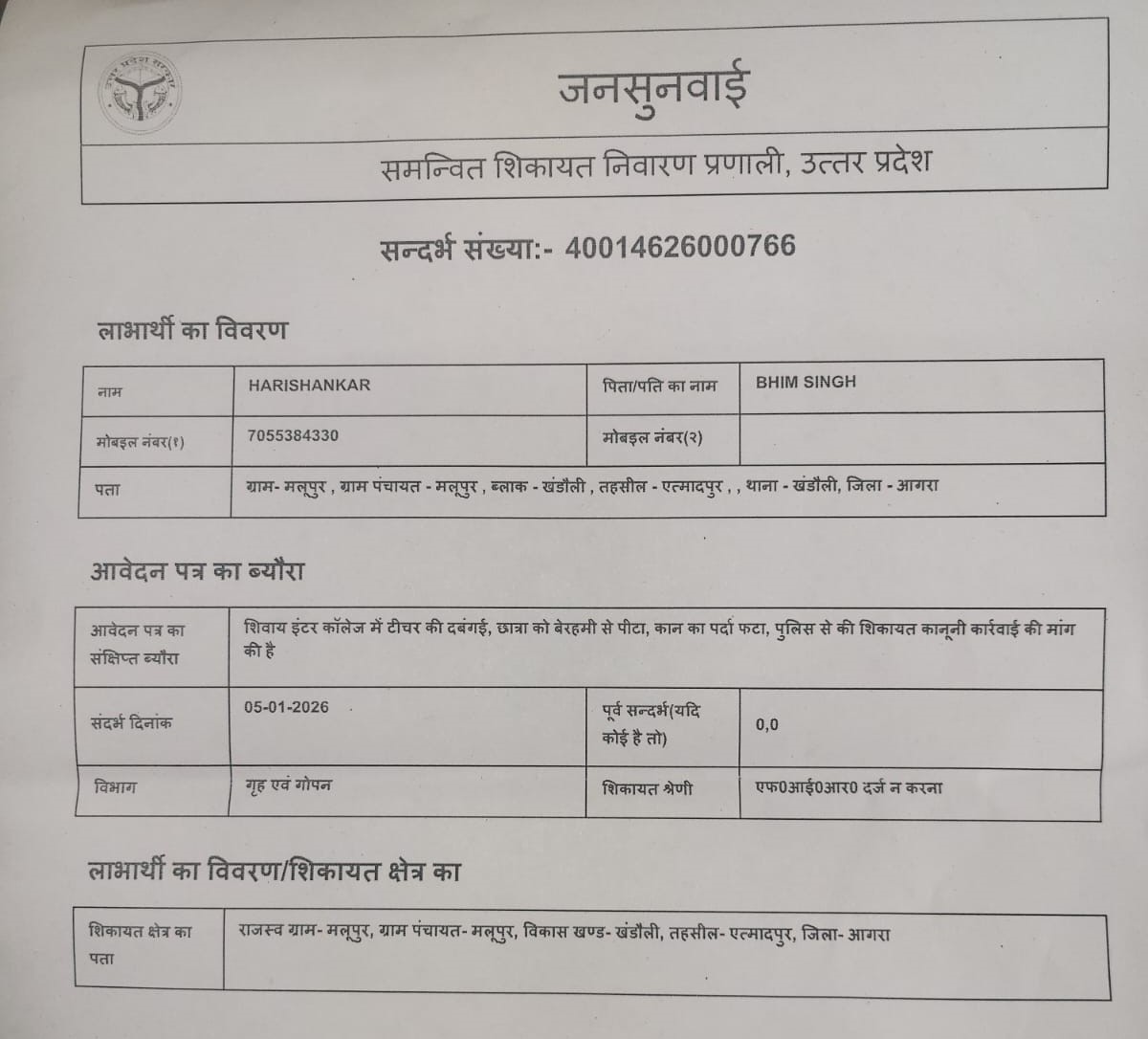 हाथरस। सादाबाद के गोविंदपुर में एक छात्रा को शिक्षिका द्वारा बेरहमी से पीटने का मामला सामने आया है। पिटाई से छात्र के कान का पर्दा फट गया, जिसके बाद उसके पिता ने पुलिस से शिकायत की है। छात्रा का निजी अस्पताल में उपचार कराया गया है। छात्रा का कहना है कि टीचर ने उसके छह थप्पड़ मारे। आपको बता दें खंदौली थाना क्षेत्र के हरिशंकर निवासी मलूपुर ने गोविंदपुर चौकी में तहरीर दी है। बताया कि उनकी 18 वर्षीय बेटी 23 दिसंबर को कॉलेज गयी थी। दो सहेलियों में झगड़ा हो रहा था और वो वहाँ मौजूद थी इतने में शिक्षिका स्वेता से कुछ कहासुनी हो गयी और राधिका की पिटाई कर दी, जिससे वह बेहोश होकर गिर पड़ी। आरोप है कि शिक्षक और स्कूल प्रबंधन ने अभिभावकों को घटना की सूचना नहीं दी, बल्कि राधिका को धमकाया कि वह घर पर इस बारे में कुछ न बताए। स्कूल से घर लौटने पर राधिका ने अपने अभिभावकों को पूरी घटना बताई। जब अभिभावकों ने स्कूल प्रबंधन से बात की, तो उन्हें कोई संतोषजनक जवाब नहीं मिला और स्कूल ने शिक्षक का पक्ष लेते हुए मामले को टाल दिया। 29 दिसंबर को जब राधिका सोकर उठी तो उसके कान में असहनीय दर्द था। अभिभावक राधिका को कान के डॉक्टर के पास ले गए, जहां जांच के बाद डॉक्टर ने बताया कि राधिका के कान का पर्दा फट गया है और उसका ऑपरेशन करना पड़ेगा। जब इस बारे में शिक्षक और स्कूल प्रबंधन से संपर्क किया गया, तो उन्होंने अभिभावकों को धमकाते हुए कहा कि यदि मामले को ज्यादा तूल दिया गया, तो राधिका का स्कूल से रजिस्ट्रेशन काटकर उसे निकाल दिया जाएगा। हरिशंकर ने अपनी शिकायत में बेटी राधिका से मारपीट करने वाली शिक्षिका और धमकी देने वाले स्कूल प्रबंधन के खिलाफ कानूनी कार्रवाई की मांग की है। पुलिस ने तहरीर के आधार पर मामले की जांच शुरू कर दी है।